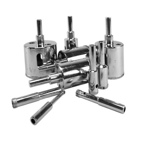 10-piece diamond dust hole sae set with 1/4-inch shank, perfect for drilling clean holes on glass, marbles, slates and tiles. Comes with the most popular size - 5/32", 1/4", 5/16", 3/8", 1/2", 3/4", 1", 1-3/16", 1-3/8", 1-5/8".