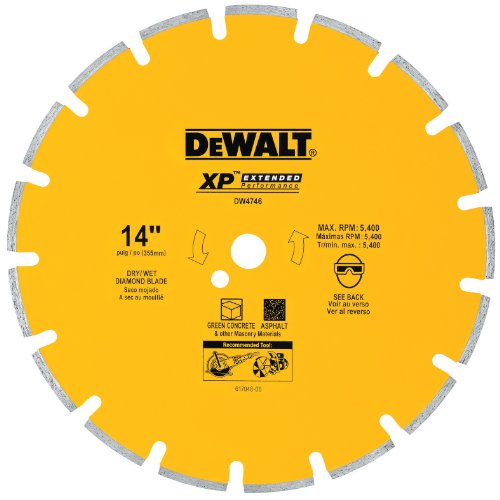 The DEWALT DW4746 XP industrial 14-inch segmented diamond saw blade provides 350 times the life of conventional abrasives, and its continuous rim turbo design ensures optimal results when used on asphalt, green concrete, brick, block, and tile. This 14-inch blade with one-inch (20 millimeter) arbor boasts a maximum speed of 5,400 RPM for use across a wide variety of applications. Let the power of diamonds do the tough work for you. The large diamond segments with cobalt provide an ideal combination for cutting through even the toughest cured concrete with exceptional accuracy.This website is a participant in the Amazon Services LLC Associates Program, an affiliate advertising program designed to provide a means for sites to earn advertising fees by advertising and linking to amazon.com